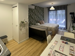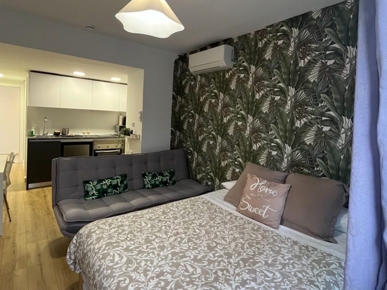 La distribución del apartamento es símil al anterior, con un único ambiente amplio en el que pasar tu estancia con una cama y sofá-cama para hospedar hasta a 3 personas.